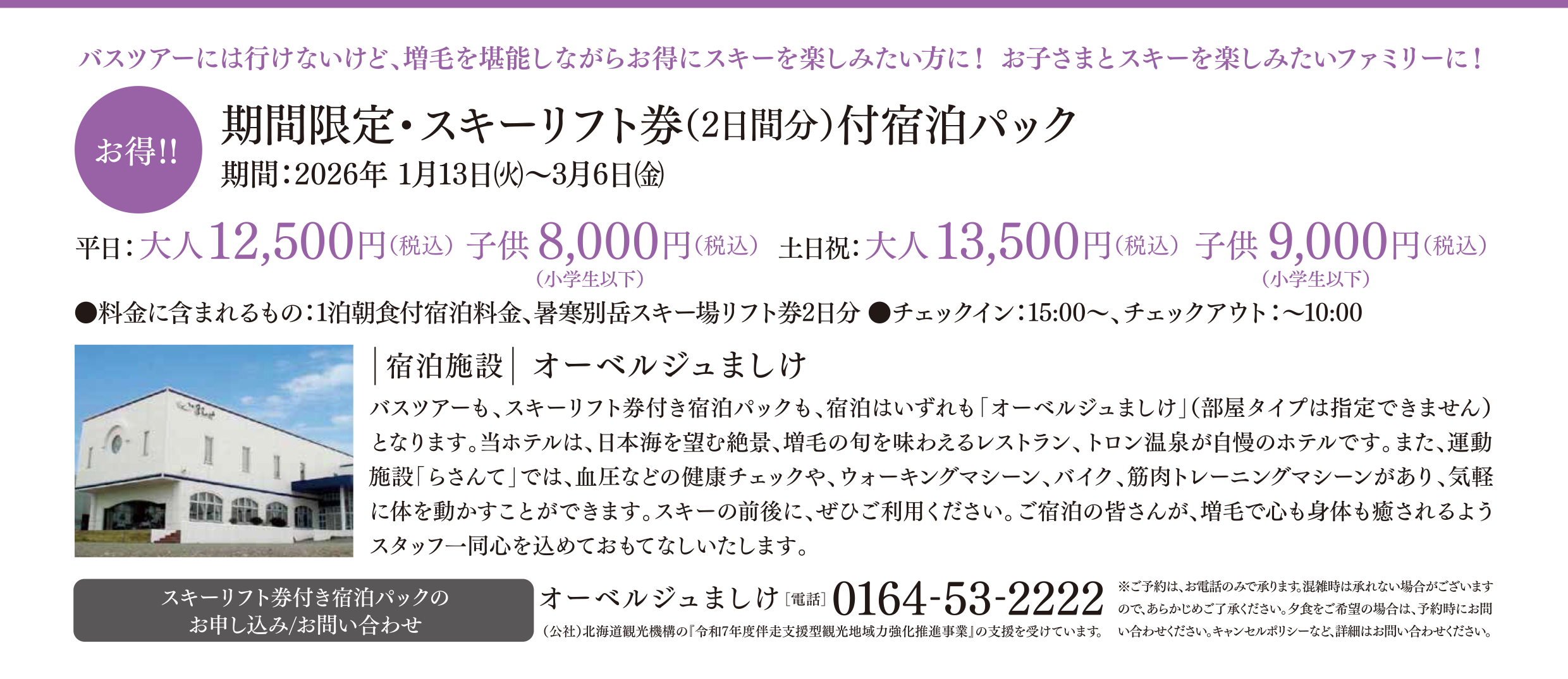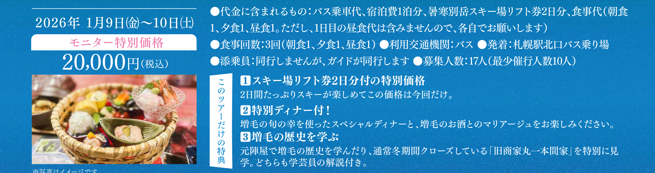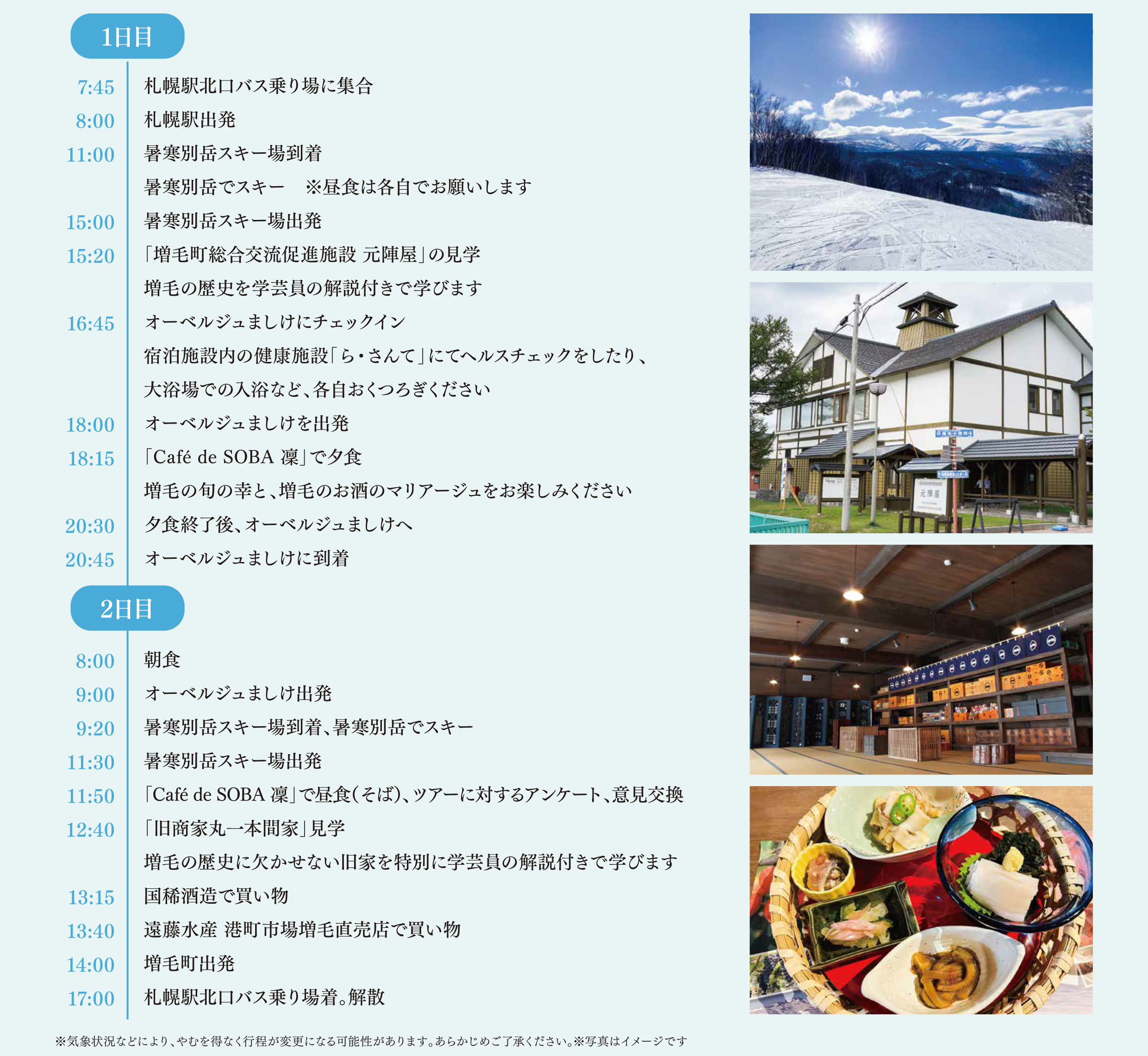 スキーを楽しみつつ、増毛の歴史や食の魅力を堪能する大人のための特別なモニターバスツアーです。